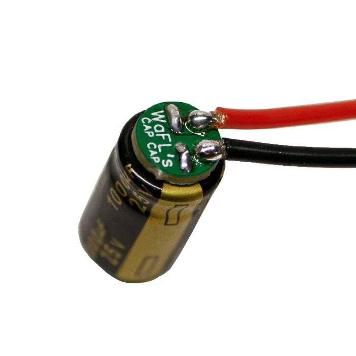 Are you tired of trying to solder wires on those pesky little capacitor leads? Step your builds up a notch with WaFL’s Cap Cap. This tiny PCB sits on the bottom of most standard “LOW ESR” capacitors and provides you with two easily accessible pads for quick and clean soldering to the capacitor. Whether you need to quickly swap a broken capacitor after a hard crash, or simply don’t have enough room near your battery pads for your cap to cleanly rest, the Cap Cap makes attaching a wire to your capacitor simple, letting you mount it anywhere on your frame. Comes in a set of 5!